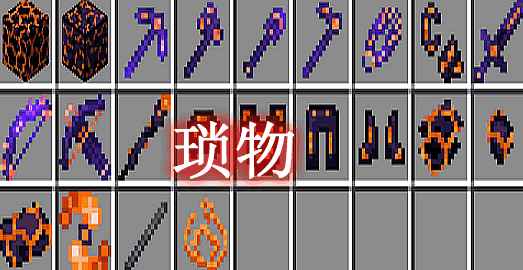 琐物 (Trifle)这款模组添加了炎曜石,一种生成在下界的稀有矿物,以及用它制成的强力装备,包括炎曜镐、炎曜斧、炎曜锹、炎曜锄、炎曜剑、炎曜弓、炎曜头盔、炎曜胸甲、炎曜护腿、炎曜靴、炎曜剪刀、炎曜弩、炎曜法杖等。