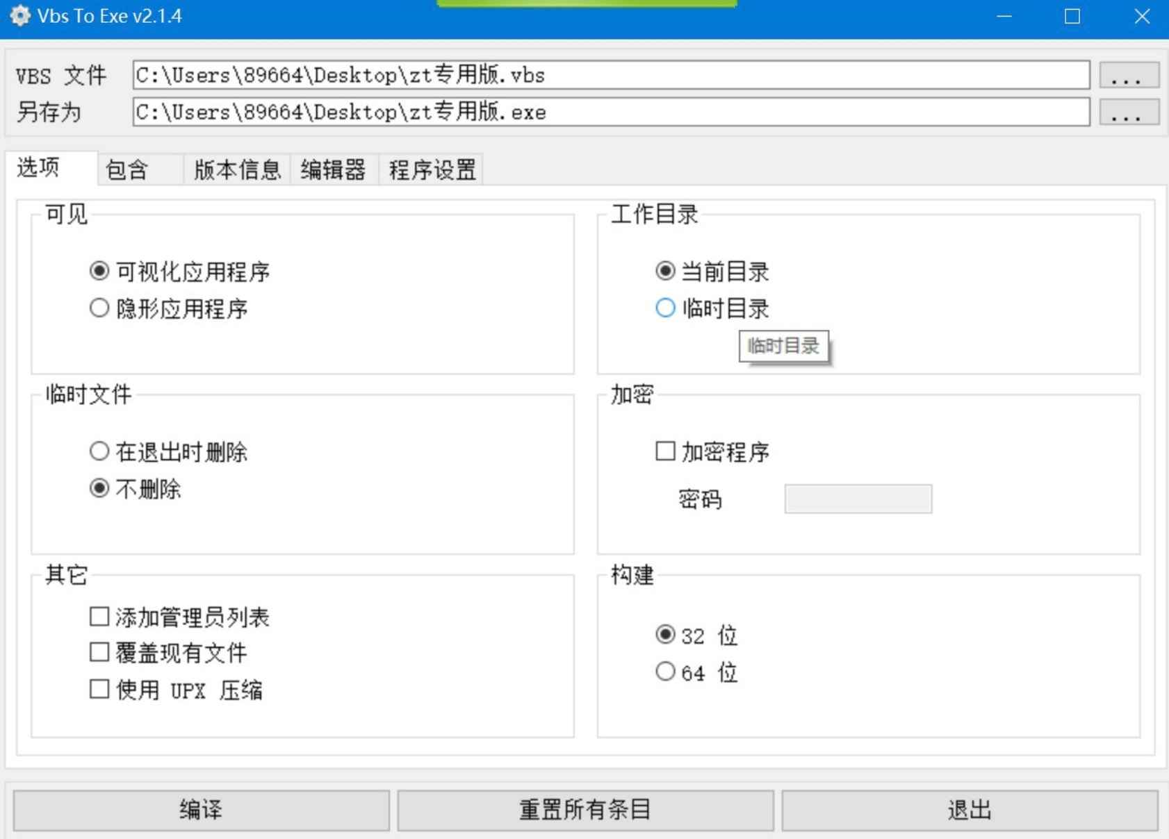 Vbs To EXE转换器竟然自带中文,所以使用方法应该不用多说,界面操作很简单。